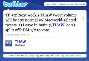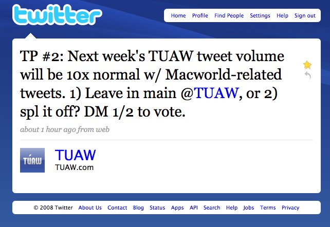 This is a nice idea from The Unofficial Apple Weblog - using Twitter simply to poll two different options (I guess you could use more, though obviously the question has to be pretty tightly written!)